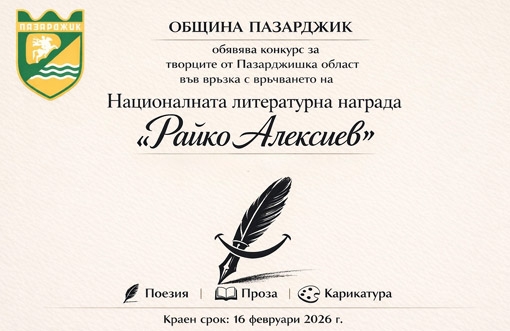 Във връзка с връчването на Националната литературна награда „Райко Алексиев“ Община Пазарджик обявяви конкурс между творците от Пазарджишка област, съобщават от общинска администрация. Конкурсът се провежда за девети път и има за цел да насърчи съвременните прояви на хумора и сатирата в литературата и изобразителното изкуство и да отдаде почит на творческото наследство на Райко Алексиев.
